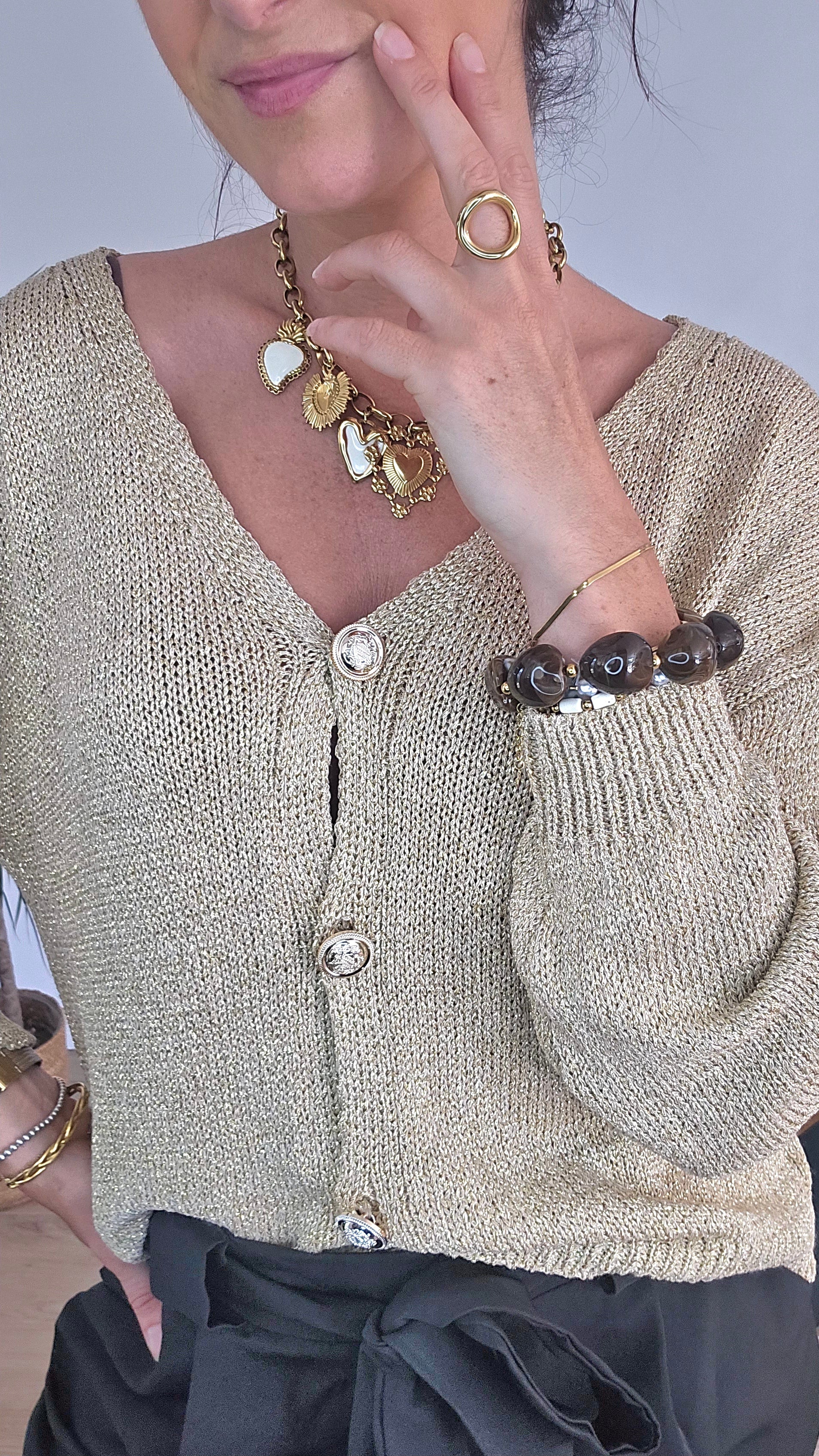 Bracelet en acier inoxydable doré et perles en pierres colorées, aux nuances naturelles et veinures élégantes. Chaque perle est séparée par une petite bille dorée en acier, apportant une touche de raffinement et de luminosité. Grâce à son montage sur élastique solide, ce bijou s’adapte aisément à toutes les tailles de poignet, offrant confort et praticité au quotidien.