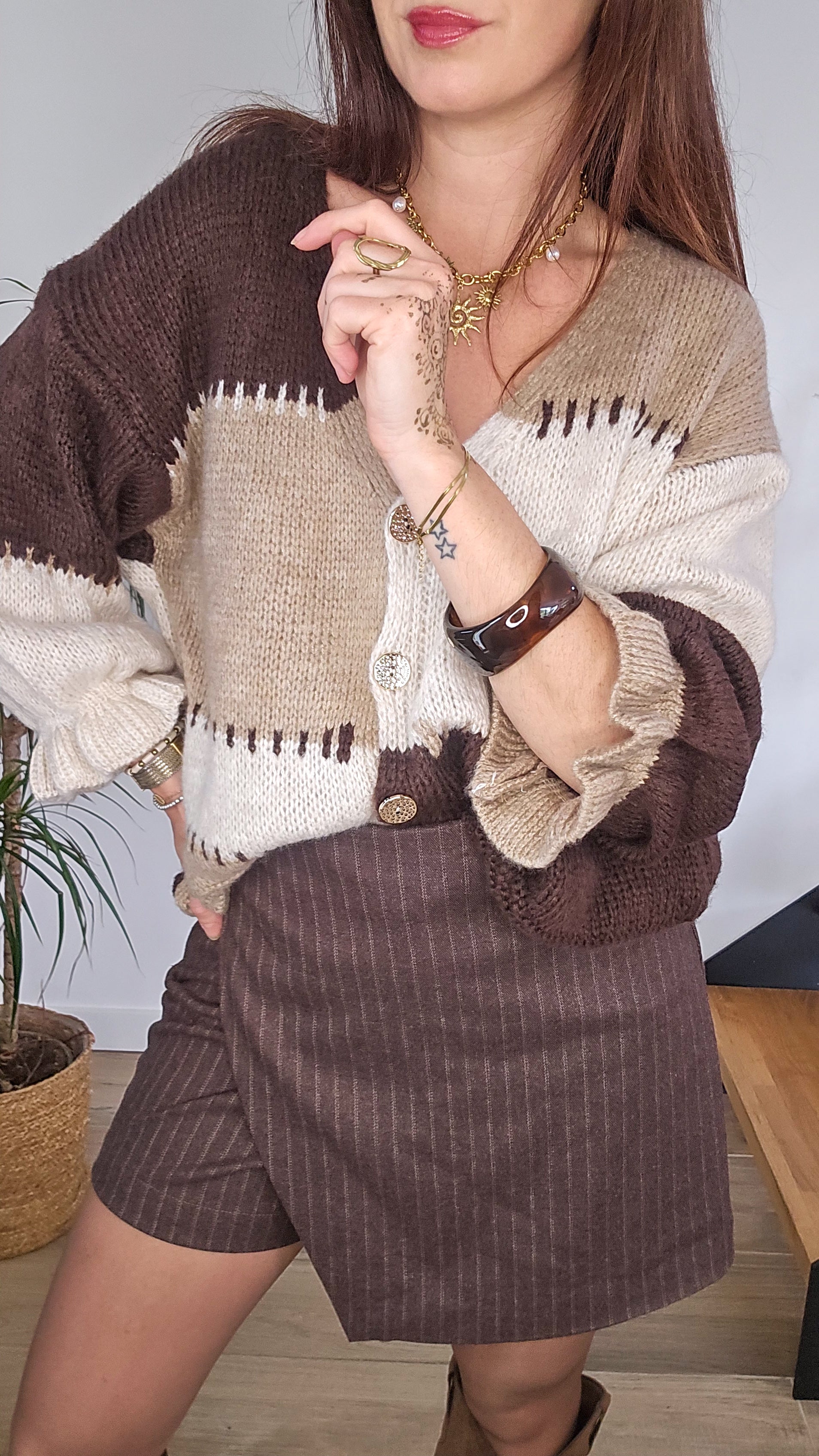 .🌸 On adore :🤎 ses tons marron & beige, ✨ sa maille douce et confortable, 👌 sa coupe facile à porter avec boutons.