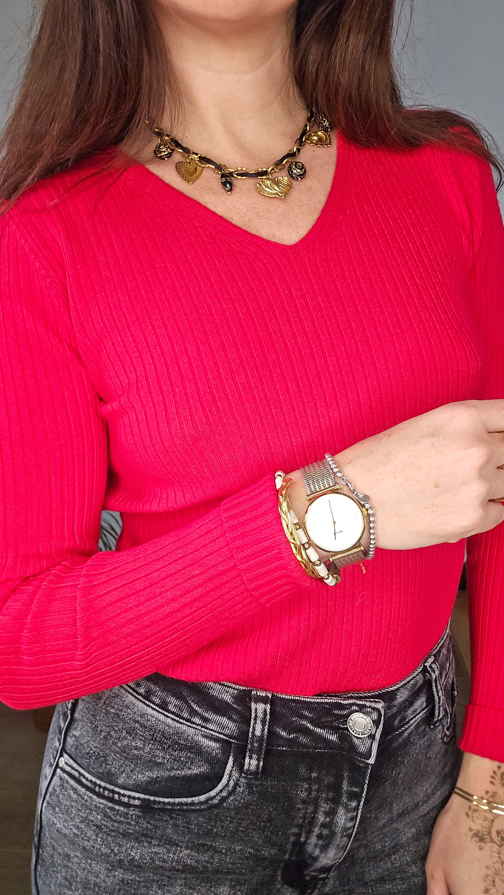 .🌸 On adore : sa couleur rouge lumineuse, son col V flatteur, sa maille confortable, un vrai basique à porter en toutes occasions.