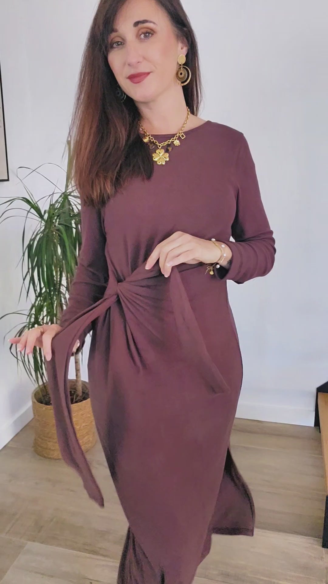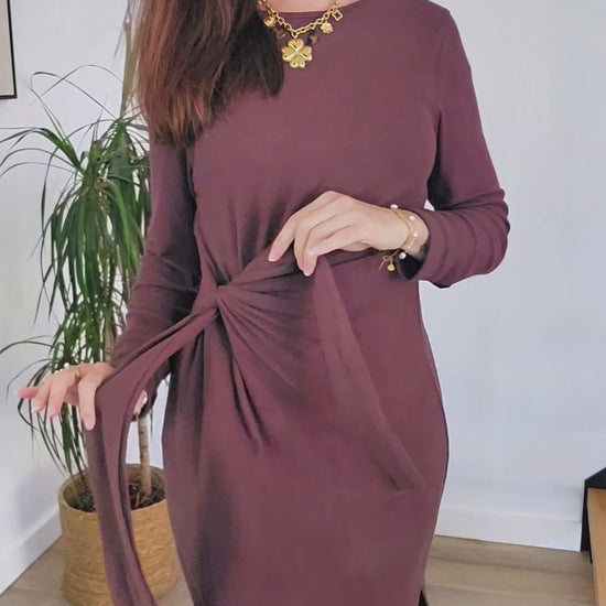 Alliez féminité et simplicité avec cette superbe robe couleur moka, pensée pour sublimer la silhouette tout en offrant un confort absolu. Son détail noué sur le devant crée un effet drapé flatteur qui affine la taille et apporte une touche d'élégance sans effort.
